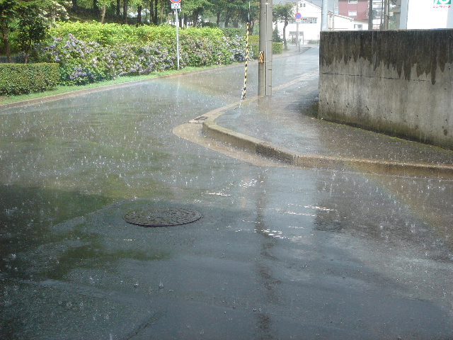 その強い雨の時に何気なく外を見たら、店の前に虹が出ていました。