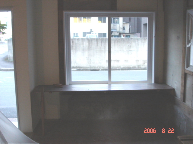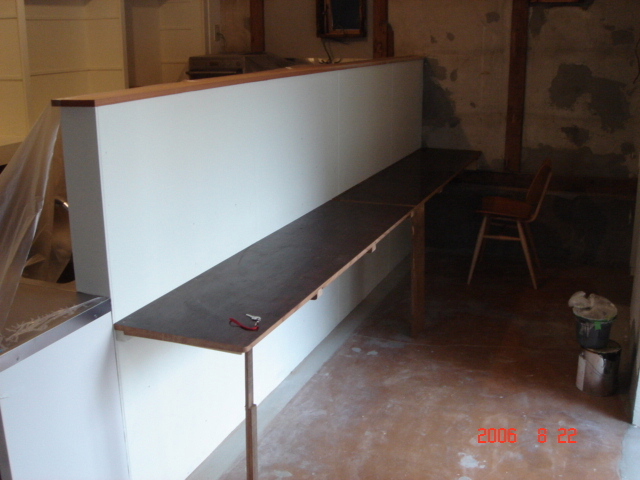 以前発掘した(メイキング-11参照)古材を使ったカウンターの取り付け。
